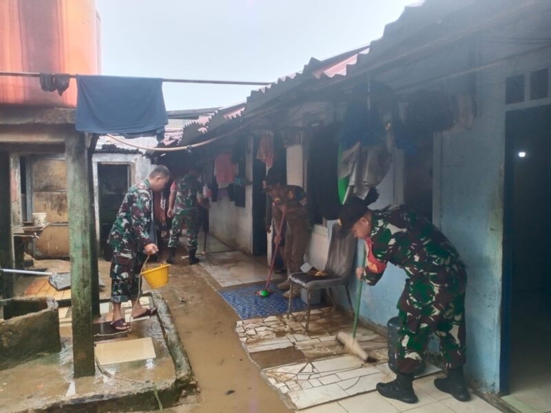 Aksi peduli Babinsa wilayah sungai beduk membantu warga membersihkan sisah lumpur di kediaman warga yang terdampak banjir