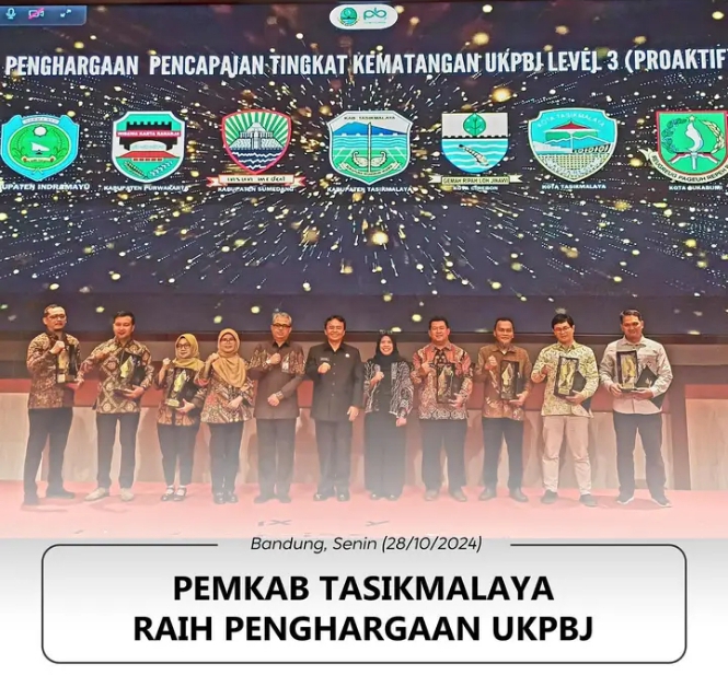 Harianposting.com Bandung – Pemerintah Daerah Kabupaten Tasikmalaya meraih penghargaan Unit Kerja Pengadaan Barang/Jasa (UKPBJ) level 3/ Proaktif dari Lembaga Kebijakan Pengadaan Pemerintah Republik Indonesia (LKPP RI). Penyerahan dilakukan oleh Plt. Kepala LKPP Republik Indonesia Iwan Herniwan, S.Si., MP dan Sekda Provinsi Jawa Barat Herman Suryatman, kepada Kabag Pengadaan Barang/Jasa Setda Kabupaten Tasikmalaya – selaku Kepala UKPBJ Kabupaten Tasikmalaya, Rd. Ruslan Munawar, di Bandung, Selasa (29/10/2024).